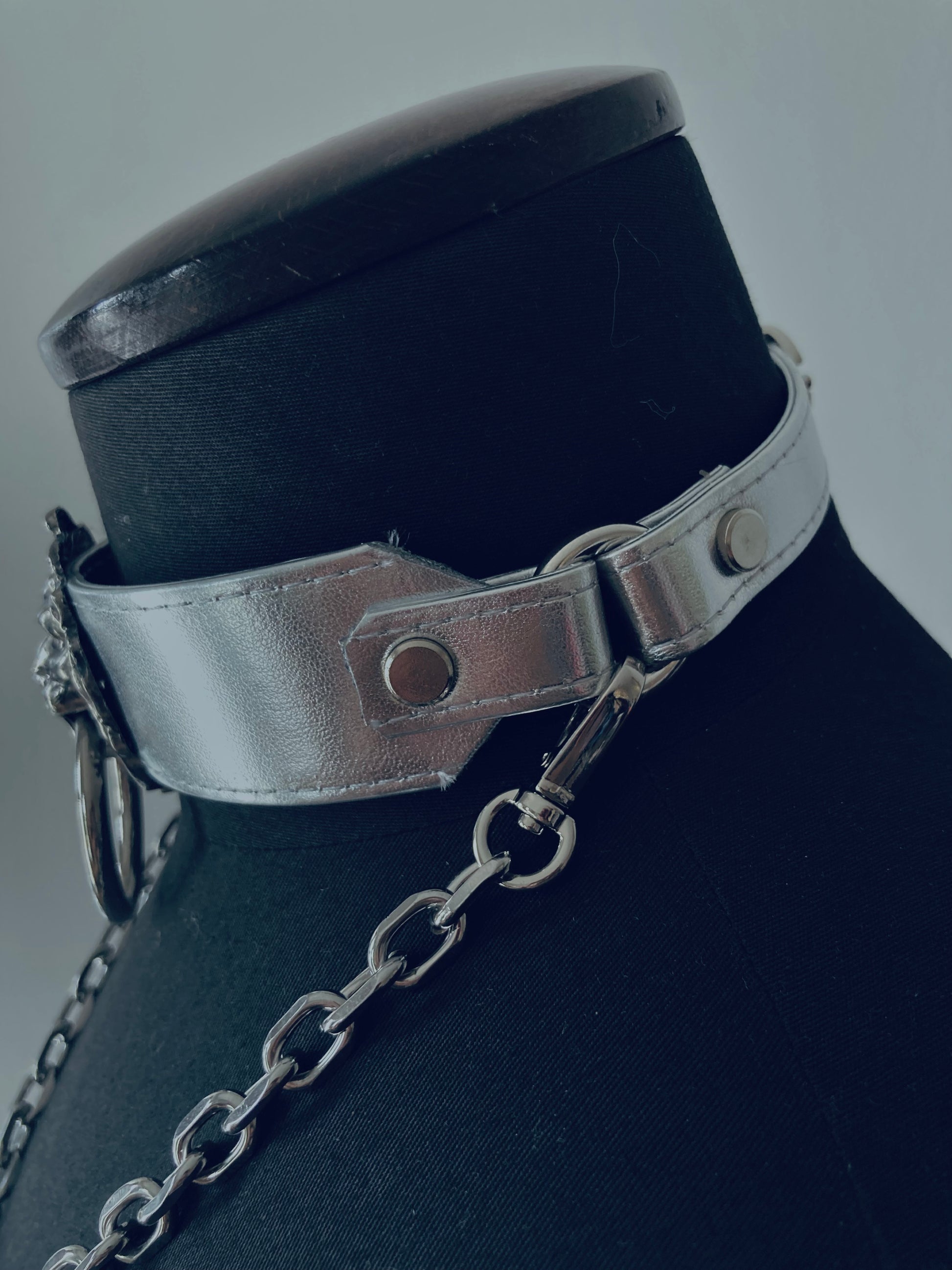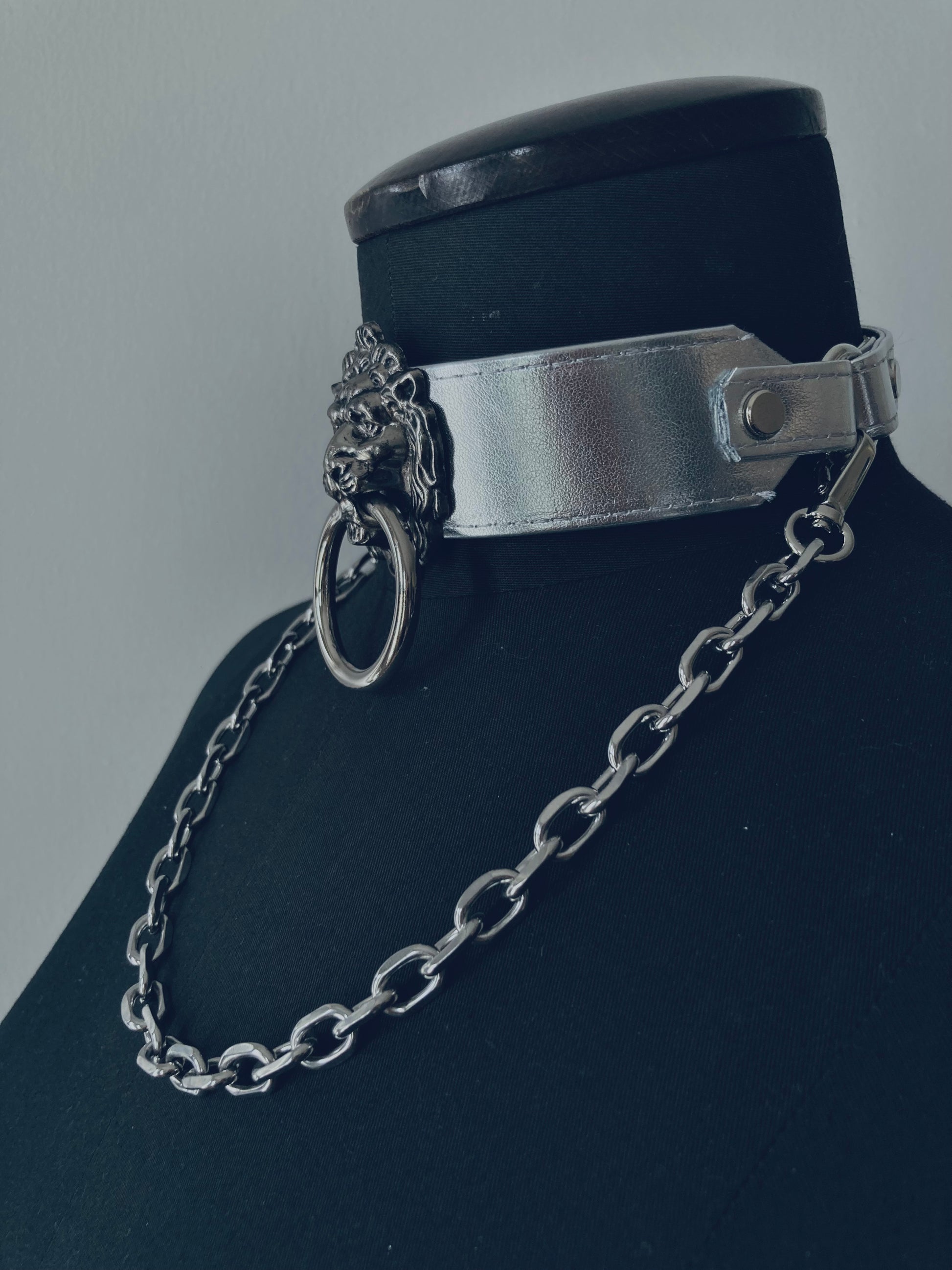 House of Marmol – Halsband mit silbernem Löwenkopf und Kette – Silber, veganes Leder und Metall