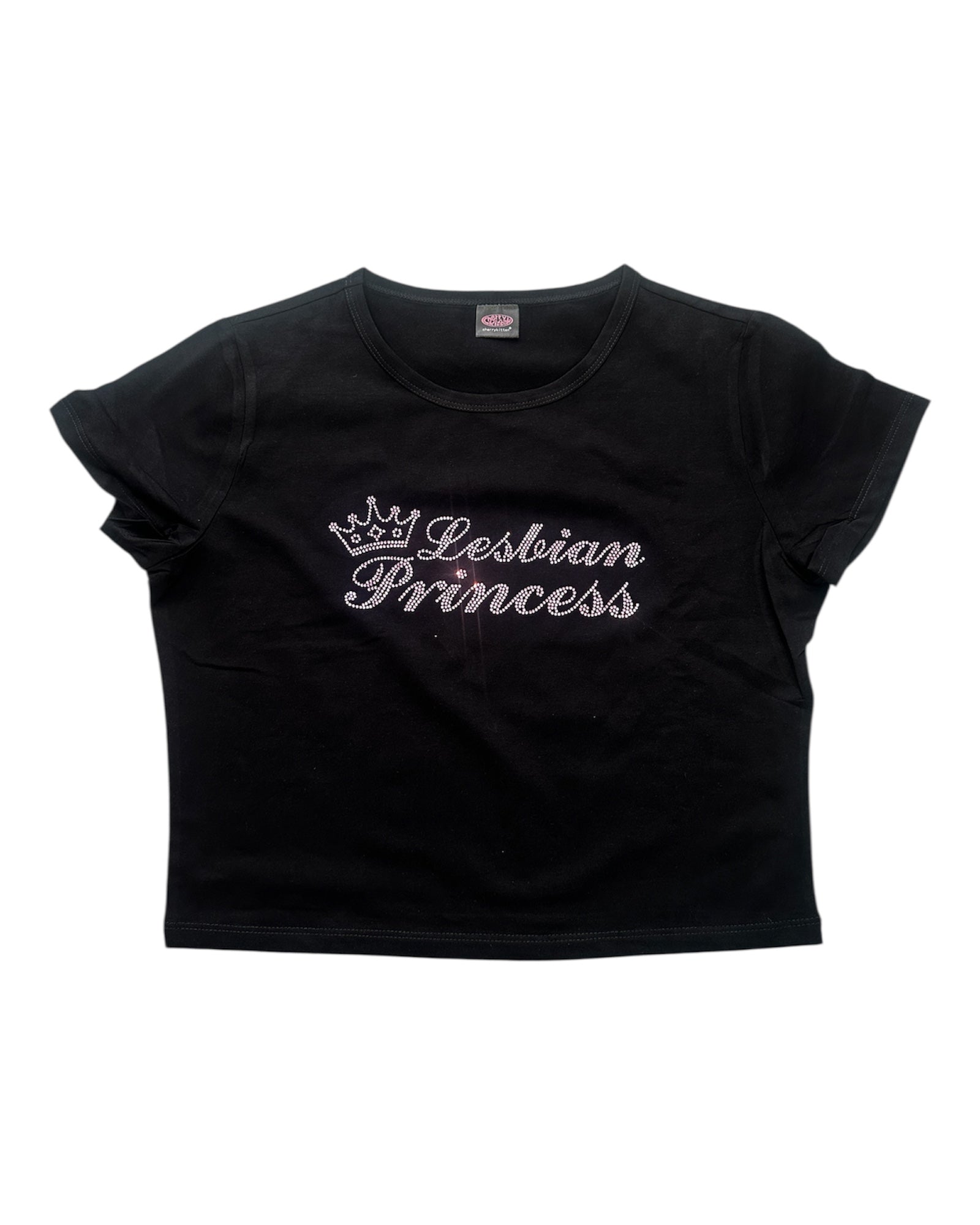 Cropped black tee with "Lesbian Princess" in pink rhinestones—for when you want to own your sapphic energy with sparkle. 100% cotton, comfy & proud.
