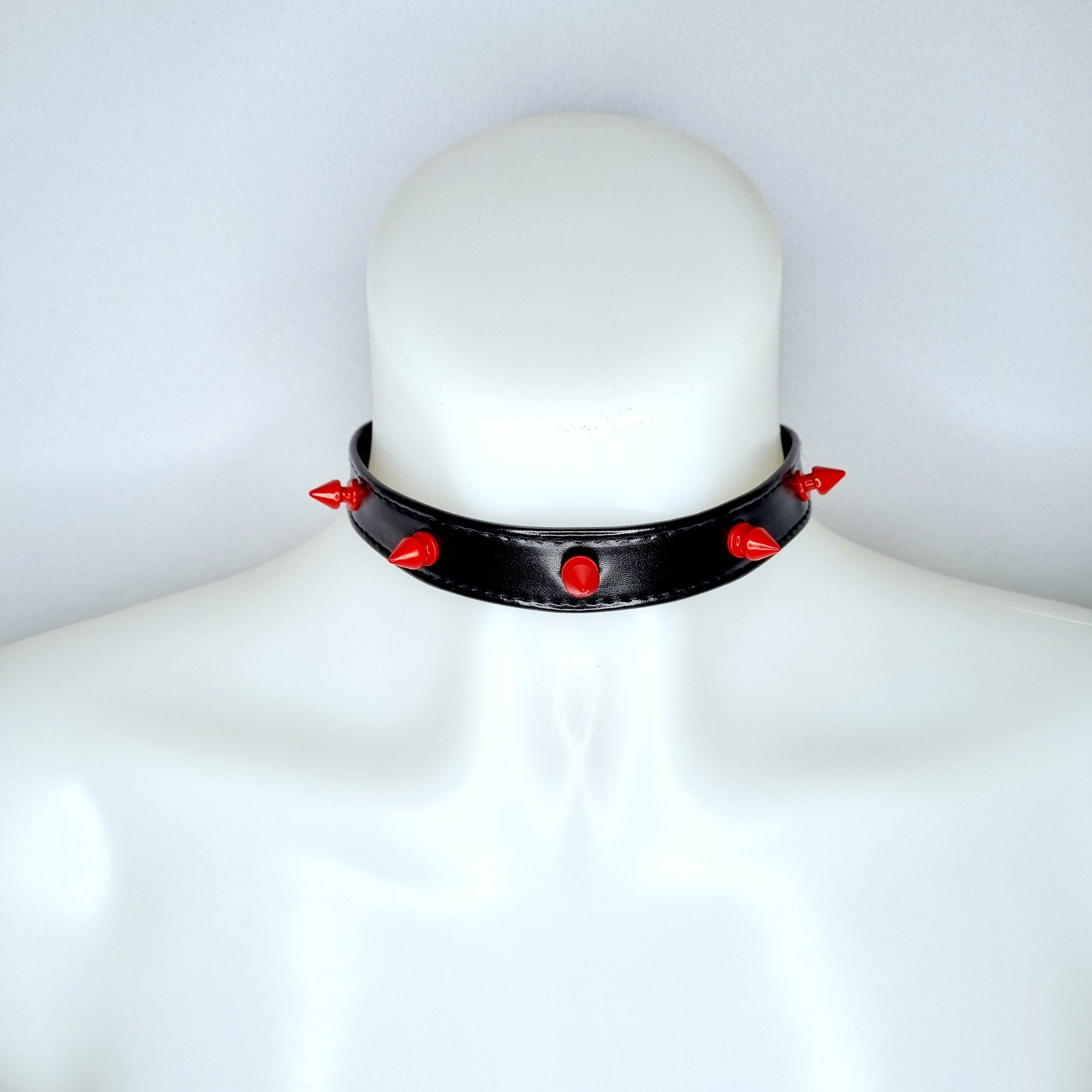 Fiery & fearless. This black faux leather choker with red spikes is for the main characters, the club queens, and anyone who's not afraid to stand out. Adjustable and comfortable, ready to wear from pre-party to after.