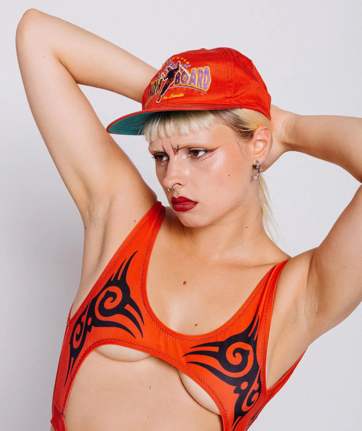 Red-hot tribal trikini with cut-outs and a string back, minimal fabric, max impact. For when you wanna serve chaos, curves & main stage energy.