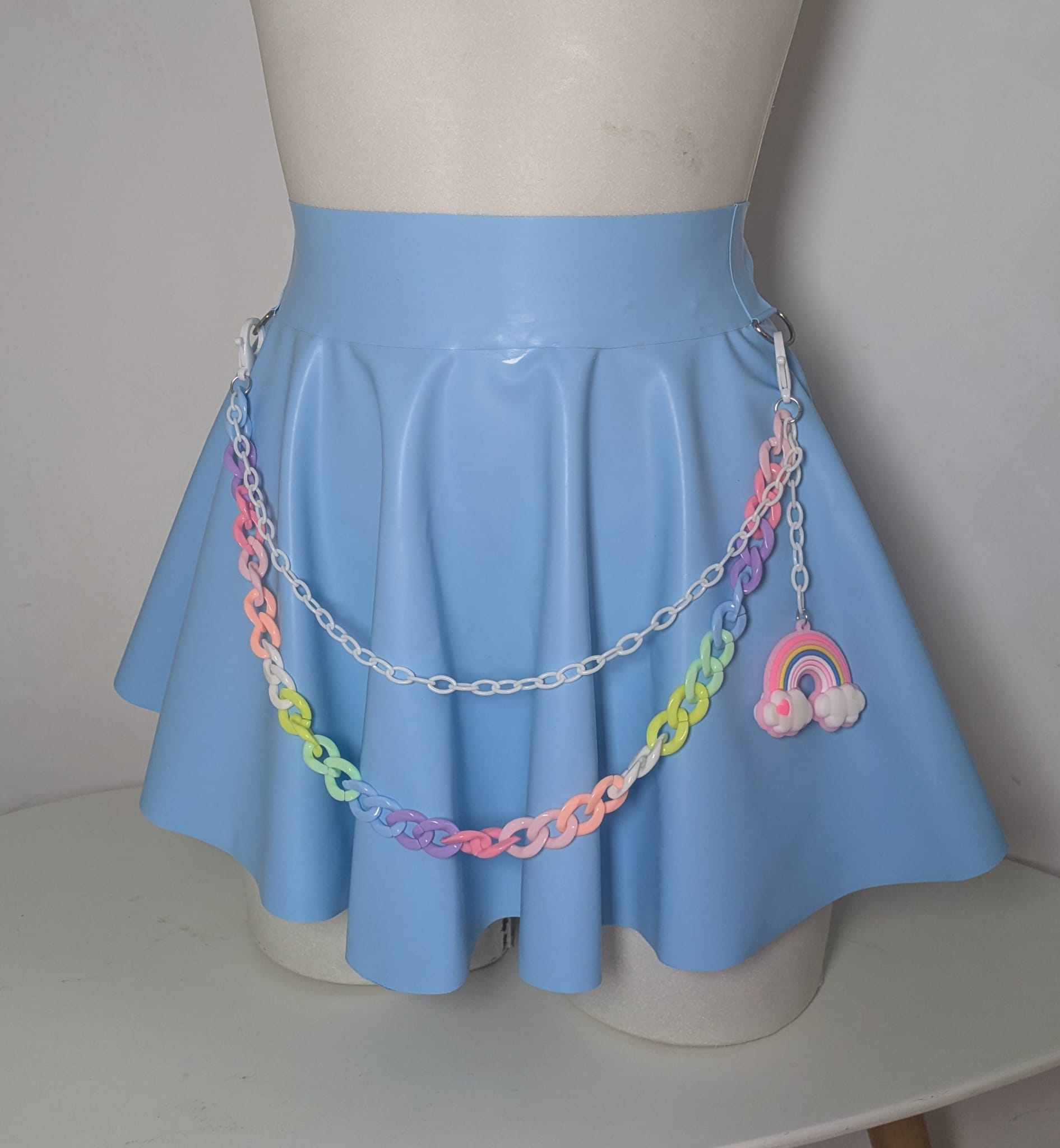 Sugar, spice, and everything shiny. This baby blue latex-look skirt is sweet with a bite. Adorned with a chunky rainbow chain and a playful rainbow charm—ready to elevate your Pride look or techno dream.