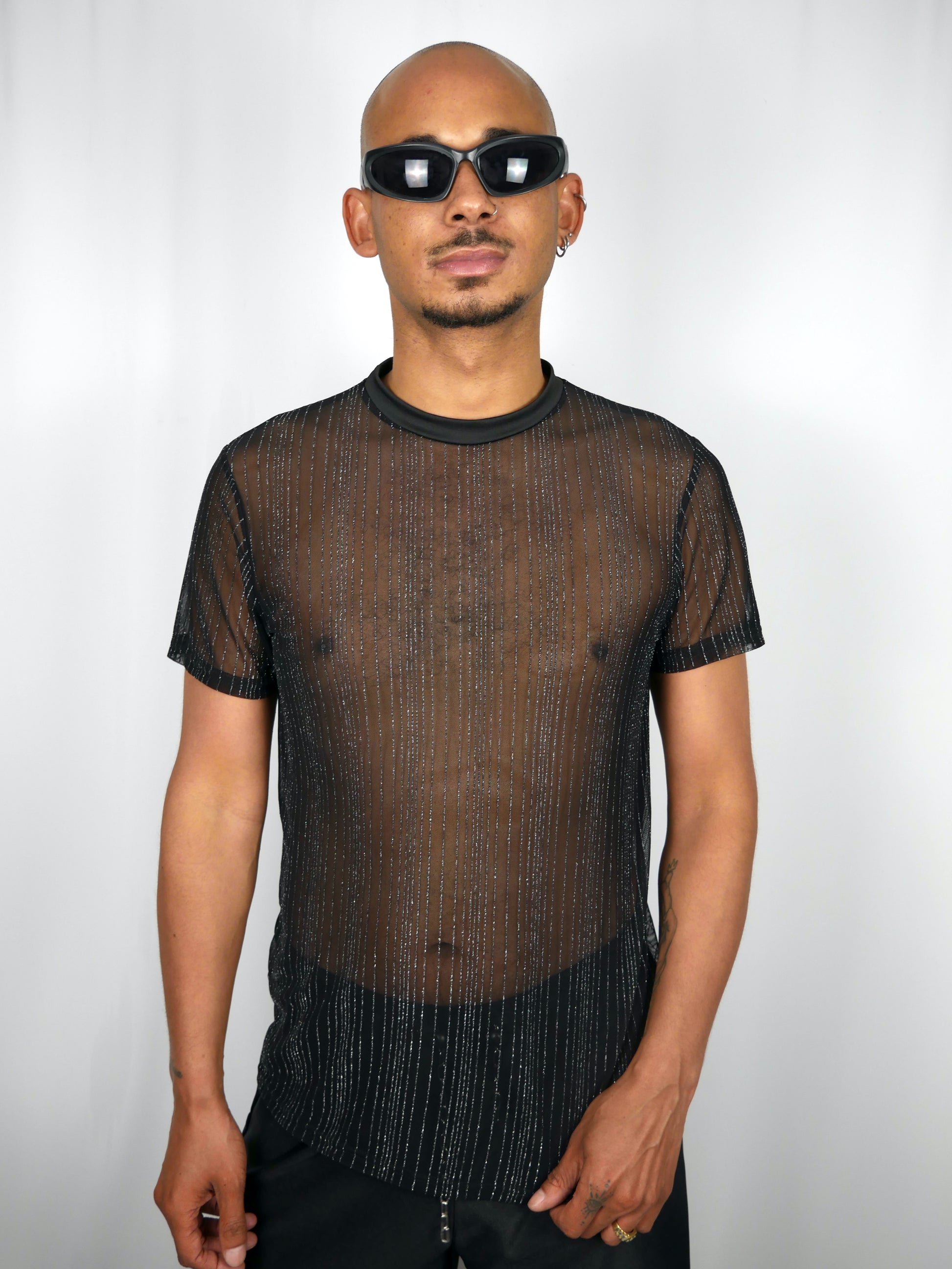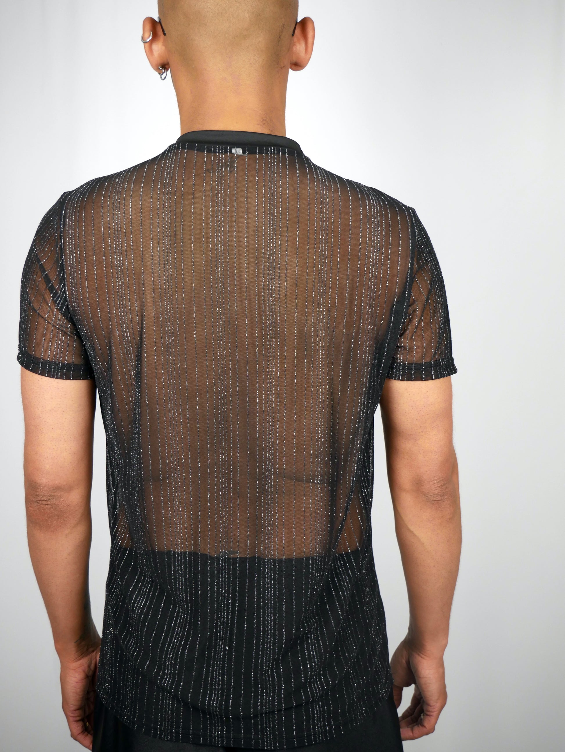 Sleek, semi-see-through, and lowkey sexy. Dit zwarte mesh t-shirt met zilveren pinstripe vibe is de ultieme rave essential. Draag 'm over niks of layer ‘m met je fave harness of tank. De licht transparante stof laat nét genoeg zien, terwijl het pinstripe patroon die edgy twist geeft. Perfect voor Verknipt, Milkshake of een onverwacht club night moment.