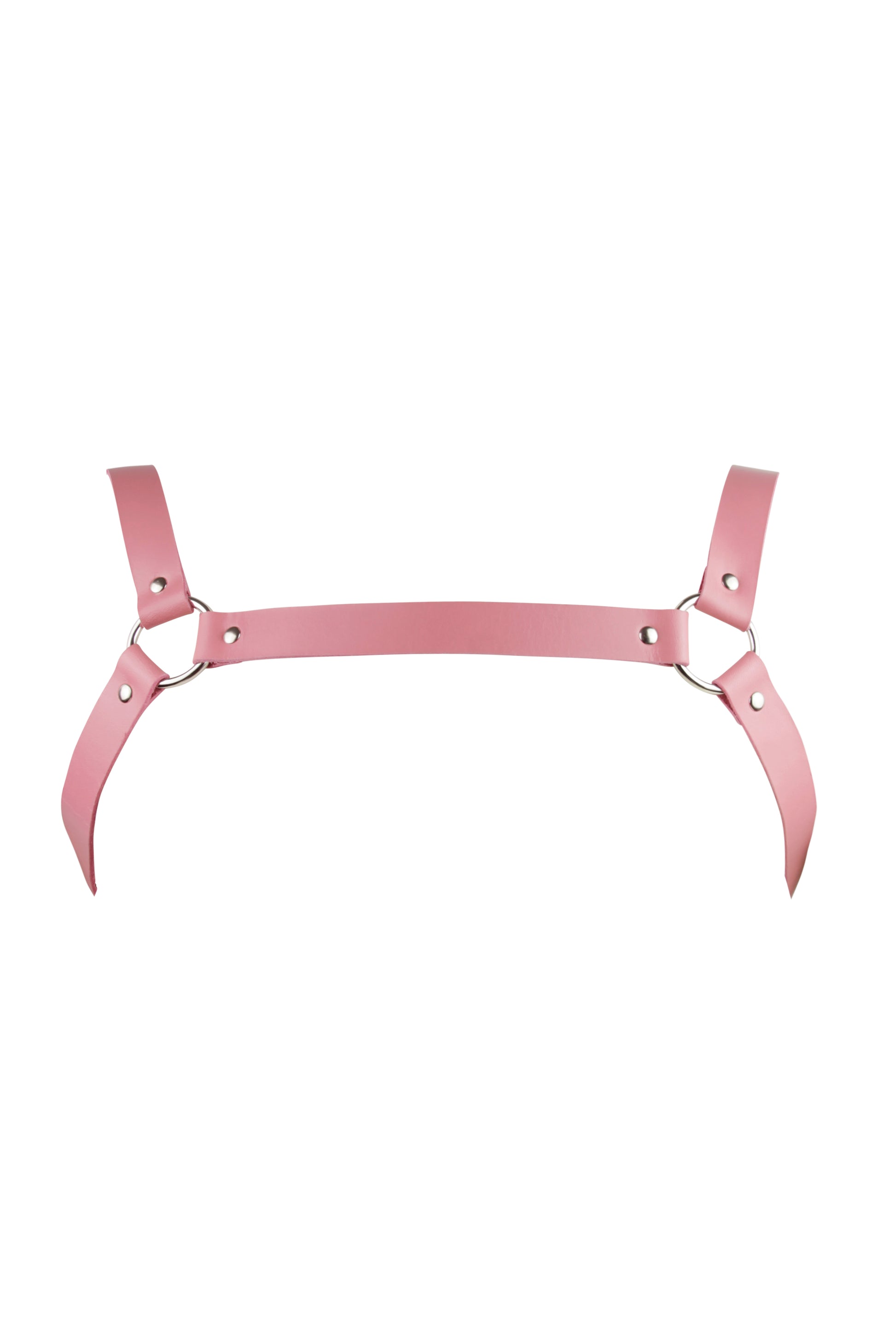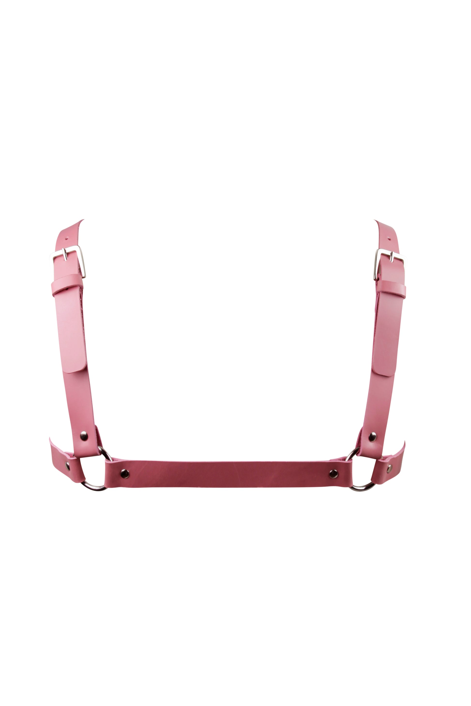 Dit roze leren rave borst harnas is handgemaakt door Studio Moonbow in Amsterdam. Dit is een genderfree leren rave harnas en kan gedragen worden door mannen en vrouwen en alles er tussen in.